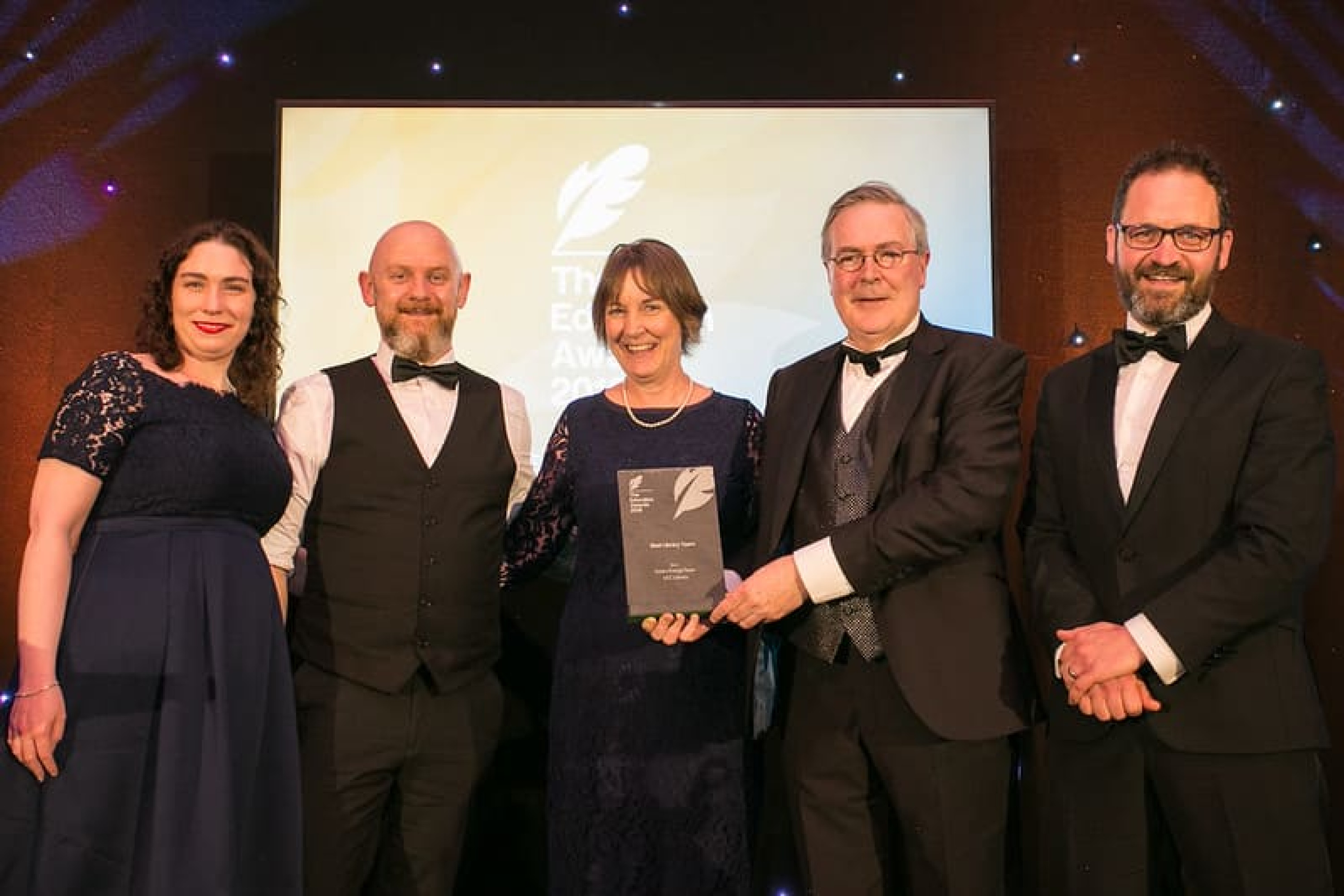 Prof. Louis Brennan, Trinity Business School presents Best Library Team Award to UCC Library Team.